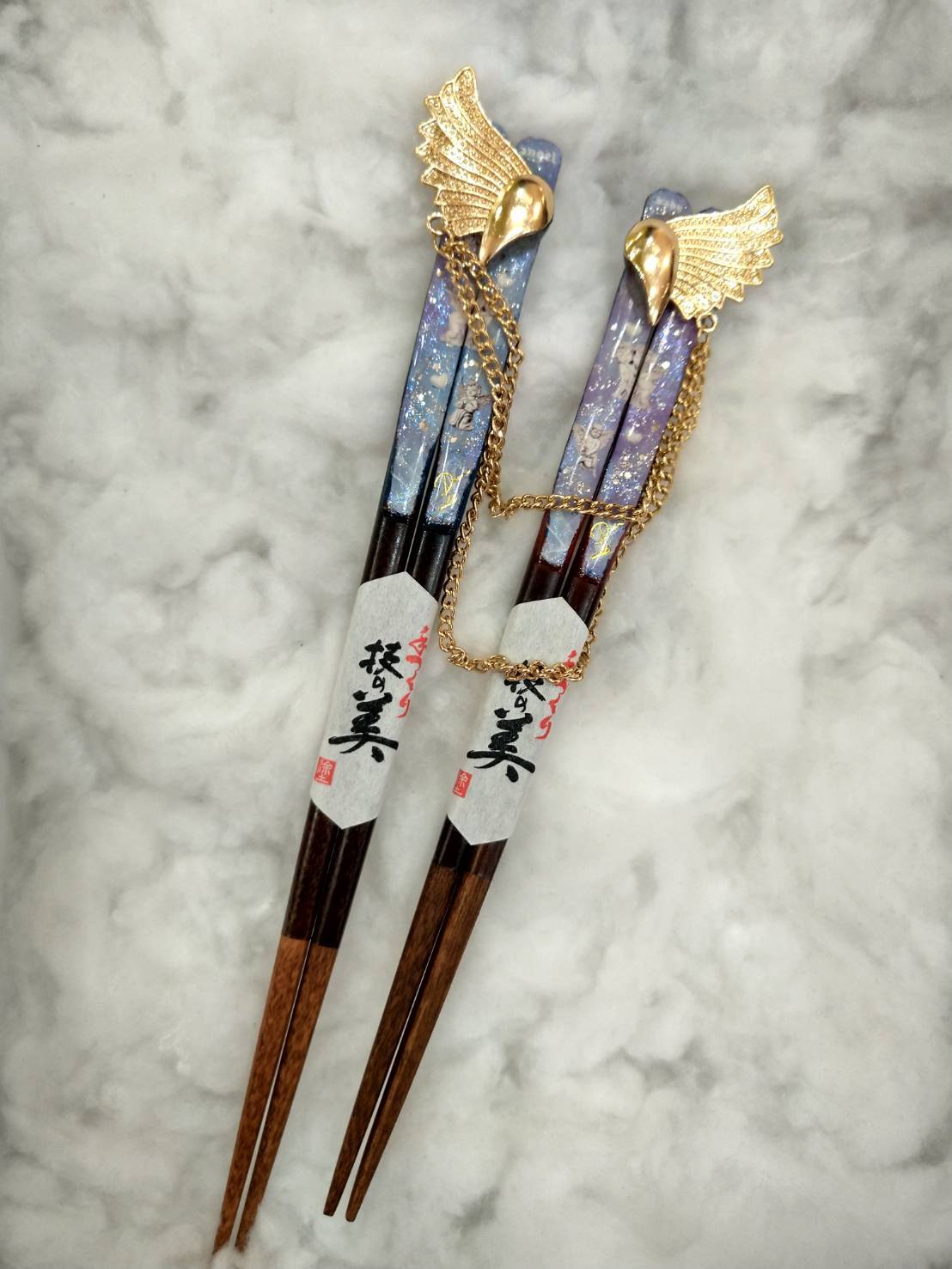 夫婦箸の片側同士を羽のモチーフと鎖で繋ぎ合わせているので、
